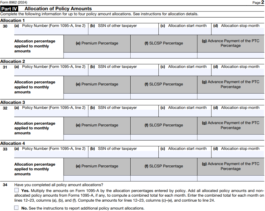 You might not need to use Part IV at all, depending on your situation. Lines 1 and 9 include notes that help you determine whether Part IV is necessary for you. Part IV is for Shared Policy Allocations. You can enter information for up to four of them. This is relevant in cases where a health care policy was shared between two “tax families.” So, if you and your spouse are filing separately but were covered by the same policy, follow the instructions for this section.