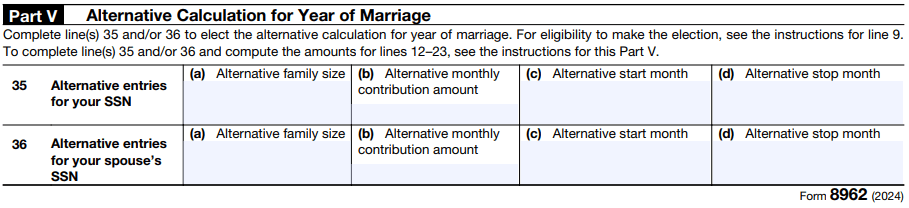Part V is only for couples who got married in the tax year for which they’re filling out Form 8962. If this isn’t you, you can ignore this section. If this is you, consult the directions to figure out whether you need to fill out this section. The chart (Table 4) in the form instructions will help you determine whether you are eligible for the alternative calculation.