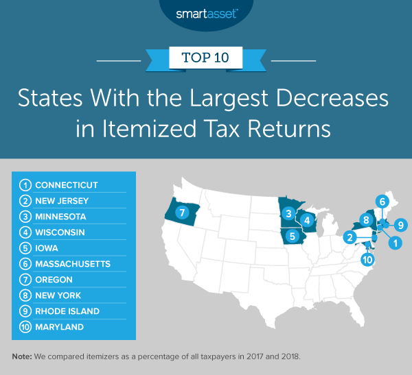 Beyond Northeastern states, three Midwestern states saw large decreases in itemizers relative to all taxpayers: Minnesota, Wisconsin and Iowa. From 2017 to 2018, the share of itemizers decreased by more than 23 percentage points in all three states. Less than 8% of taxpayers in both Wisconsin and Iowa itemized their taxes in 2018.