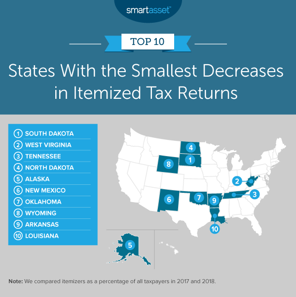 The four other Southern states include Tennessee, Oklahoma, Arkansas and Louisiana, while the four other Midwestern and Western states include North Dakota, Alaska, New Mexico and Wyoming. As previously noted, residents must match their federal and state itemization status in Oklahoma and New Mexico. Additionally, all 10 states with the smallest decreases in the share of itemizers have fewer upper-middle-class earners than the national average (5.19%). In 2018, the average percentage of taxpayers earning between $200,000 and $500,000 across those 10 states was 3.65%.
