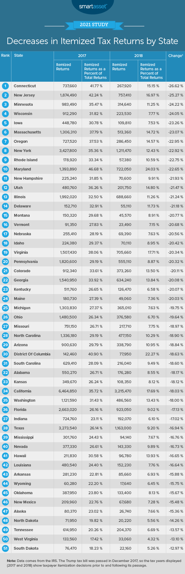 All data for this report comes from IRS. To find the states with the largest and smallest decreases in the share of itemizers, we compared itemizers as a percentage of all taxpayers in 2017 and 2018. We then calculated the percentage point difference between those two figures.